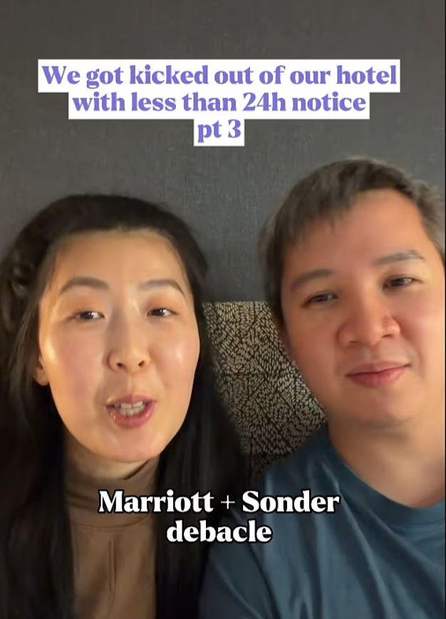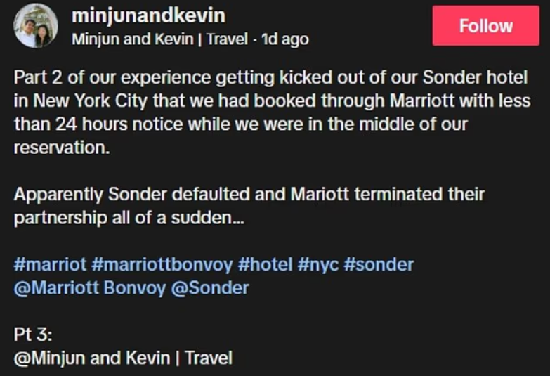 另一对来自纽约的旅客 Minjun和Kevin 在视频中愤怒表示:“我们在Sonder订的纽约酒店突然被取消,只有不到24小时的通知。