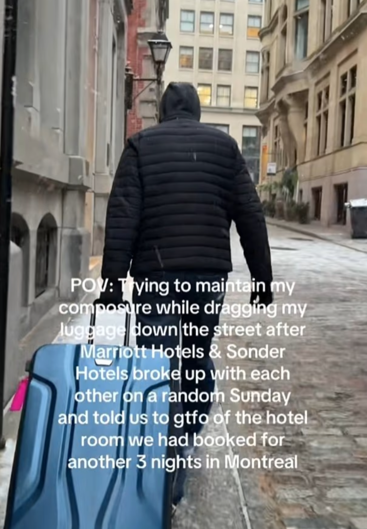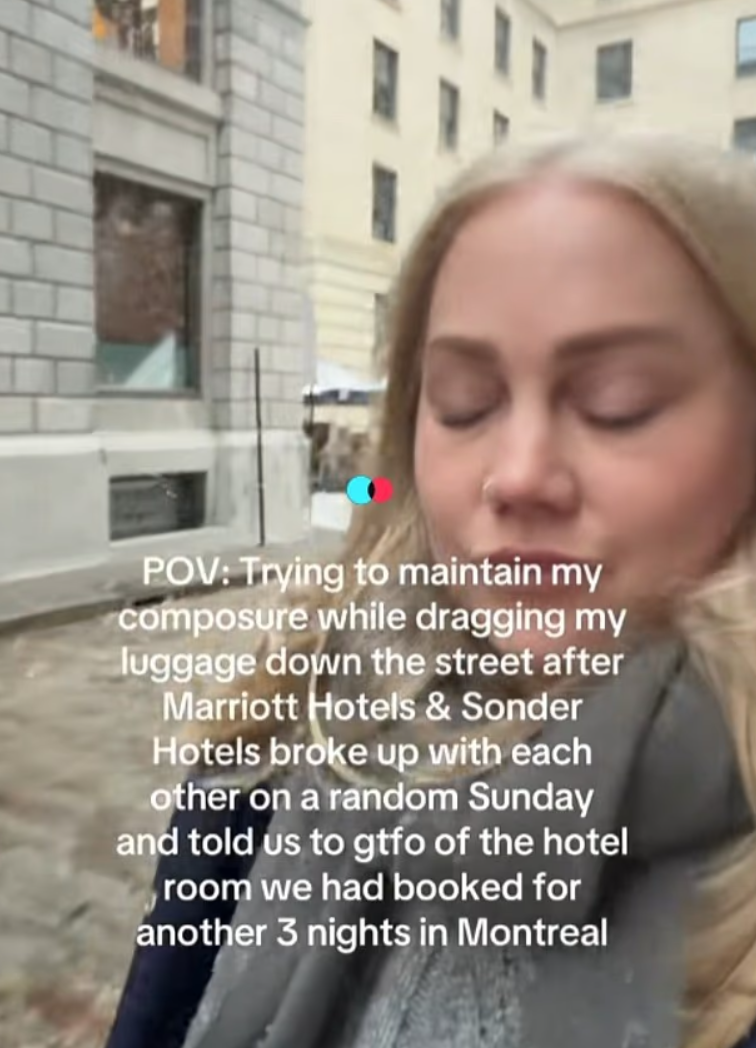一位来自加拿大埃德蒙顿的TikTok用户 Avery,发布了她在蒙特利尔的经历:“努力保持冷静地拖着行李走在雪地上……因为万豪和Sonder在一个随机的星期天‘分手’,让我们立刻滚出预订好的房间。”
