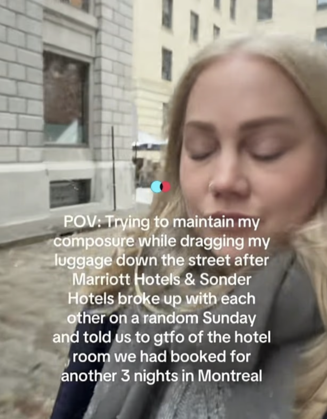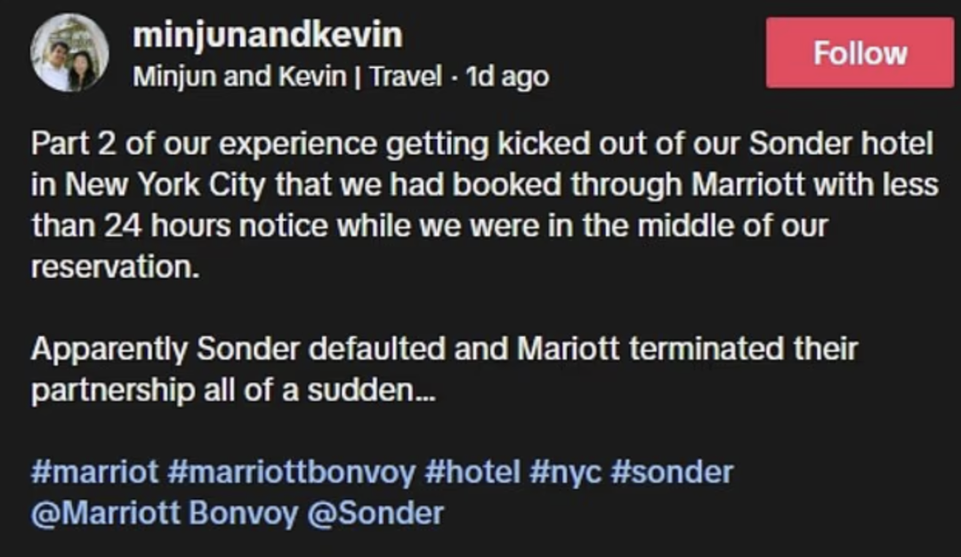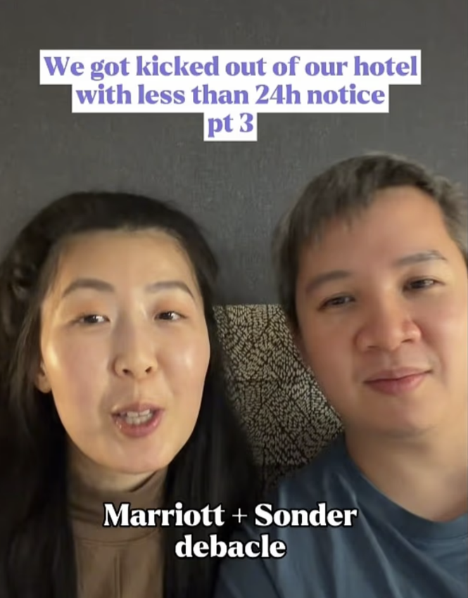 在纽约,一对亚裔情侣Minjun和Kevin也拍视频吐槽:“我们在入住中途突然被赶出 Sonder 酒店,只提前不到24小时通知。根本没地方住。”