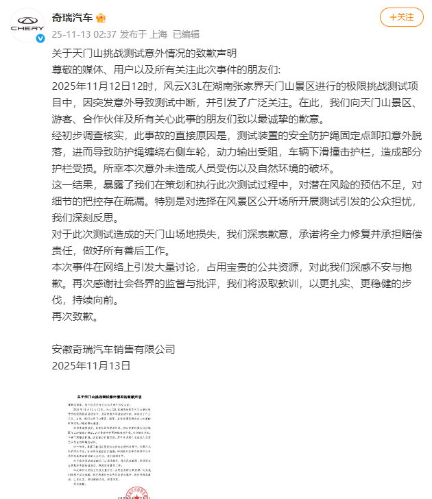据奇瑞汽车官博消息,安徽奇瑞汽车销售有限公司11月13日发布《关于天门山挑战测试意外情况的致歉声明》: