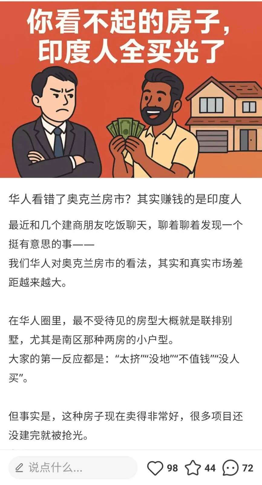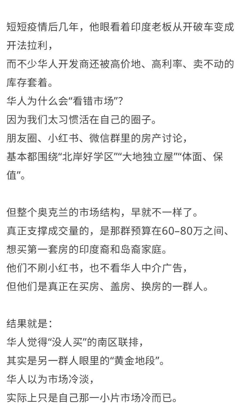 这个华人网友认为,现在新西兰的华人“太习惯活在自己的圈子。房产讨论基本都围绕北岸好学区、大地独立屋、体面、保值”,“其实只是一小片市场”,完全不了解在奥克兰,很大范围内,真正支撑成交量的,是“那群预算在60-80万之间、想买第一套房的印度裔和岛裔家庭”。