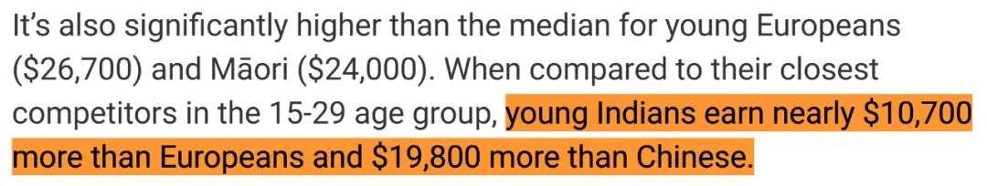 15到29岁的印度裔青年,年收入中位数$37,400,不仅甩开同龄的欧裔($26,700)和毛利人($24,000),甚至比华人同龄人高出近两万纽币。