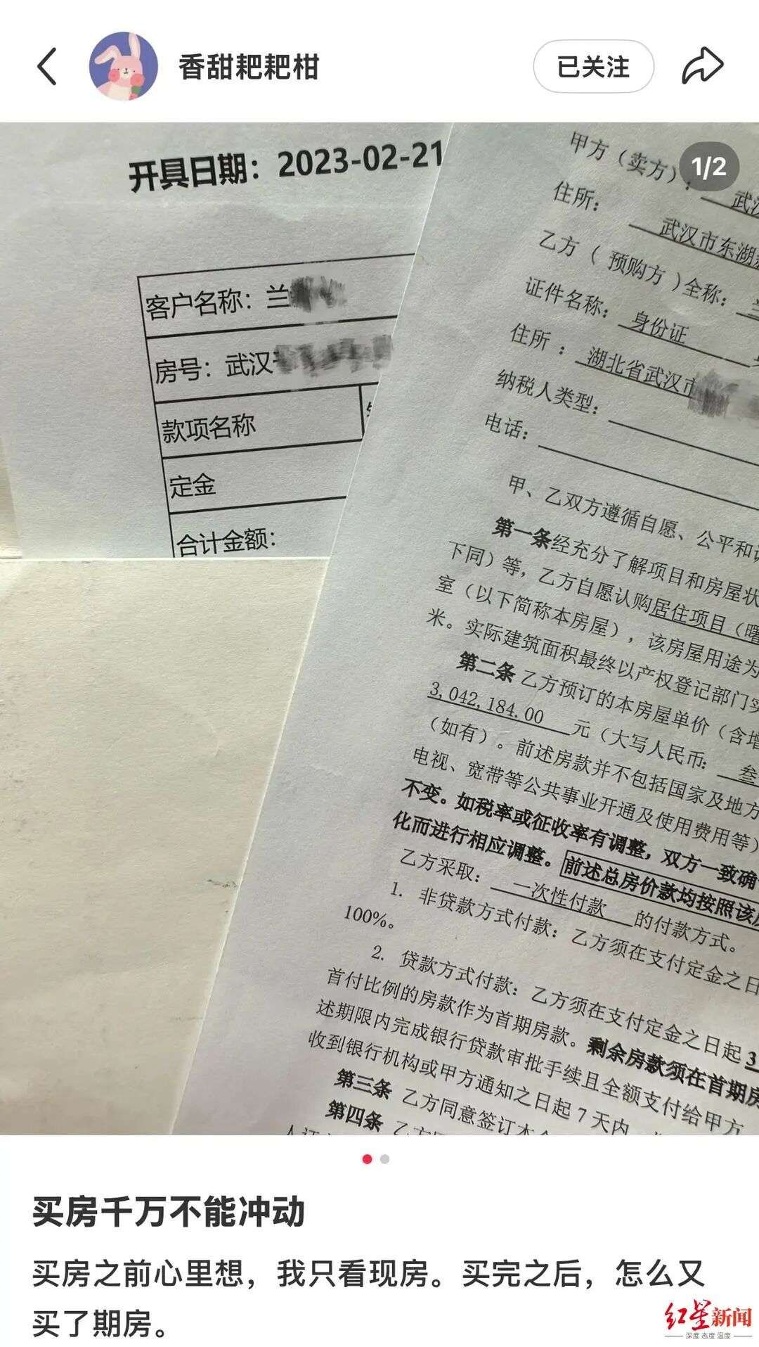 针对陈老板的说法,红星新闻多次尝试联系@香甜耙耙柑,但截至发稿并未获得回应。红星新闻记者对比其在个人社交平台发布的多条动态发现,2023年5月31日,@香甜耙耙柑晒出的购房合同信息显示,其所购房产总价确为300万元左右,且房产也的确位于武汉市东湖新技术开发区(即武汉光谷),客户名称处显示该客户姓兰。此外,@香甜耙耙柑分别在2023年3月31日、同年5月28日两次晒出银行大额存单。