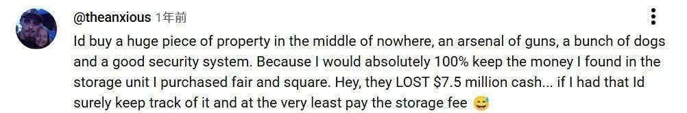 “我会在荒郊野外买一大块地,弄一批枪支弹药,养几条狗,再装一套完善的安保系统。因为我绝对会把这笔钱100%留下,仓库是我正大光明买下来的。嘿,他们丢的是750万刀的现金啊......如果我拿着这么多钱,我肯定会好好保管,至少会付租仓库的钱。”