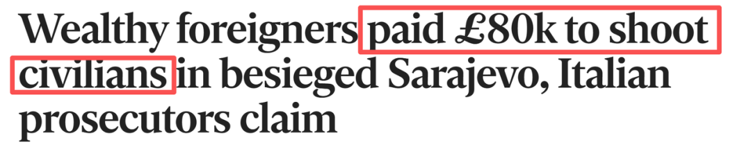 据意大利媒体披露,上世纪90年代波斯尼亚战争期间,竟有部分意大利富人出资参与了一种名为“人类狩猎旅游”(Human Safari)的残忍活动,他们付钱“体验射杀平民”的“乐趣”。