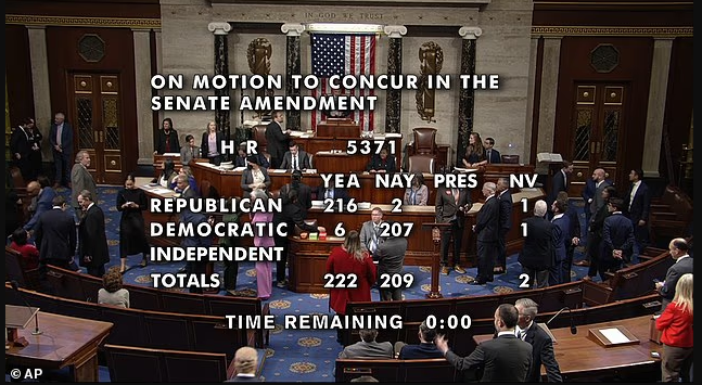 美东时间晚间 8 时 20 分,众议院以 222 票对 209 票通过了这项支出法案,正式为持续 43 天的政府停摆画上句号。