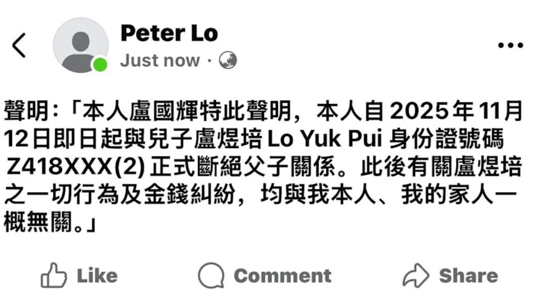 声明中措辞严厉,卢国辉明确表示,此后与卢煜培的一切行为及金钱纠纷,均与本人及家人无关。