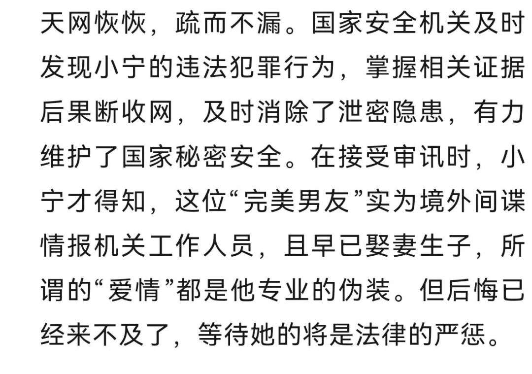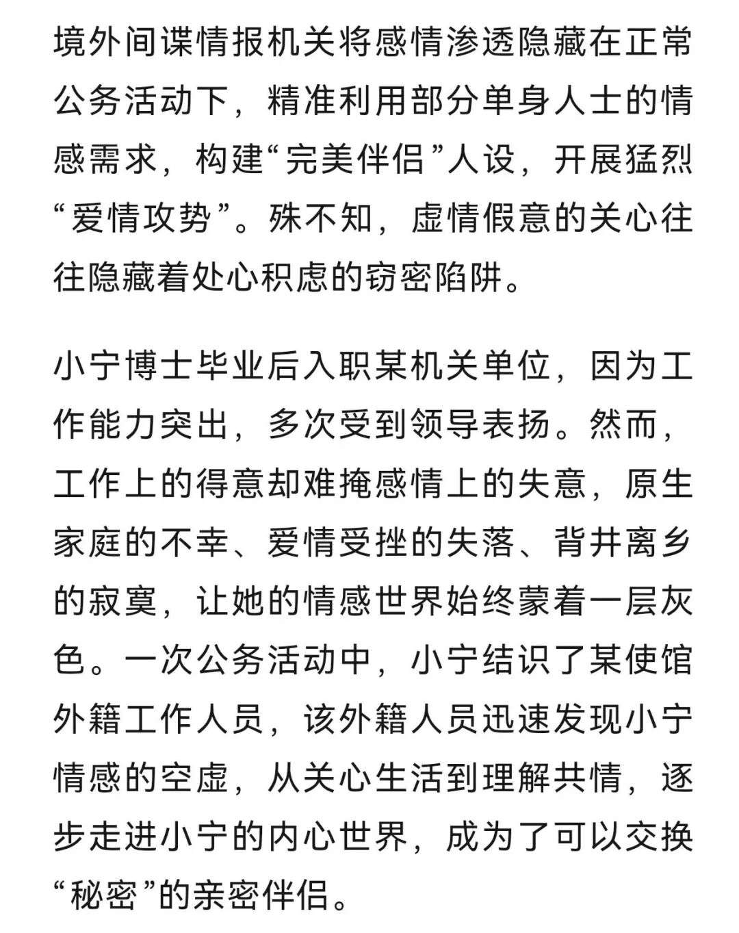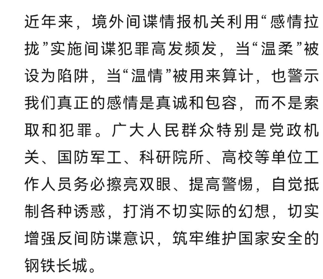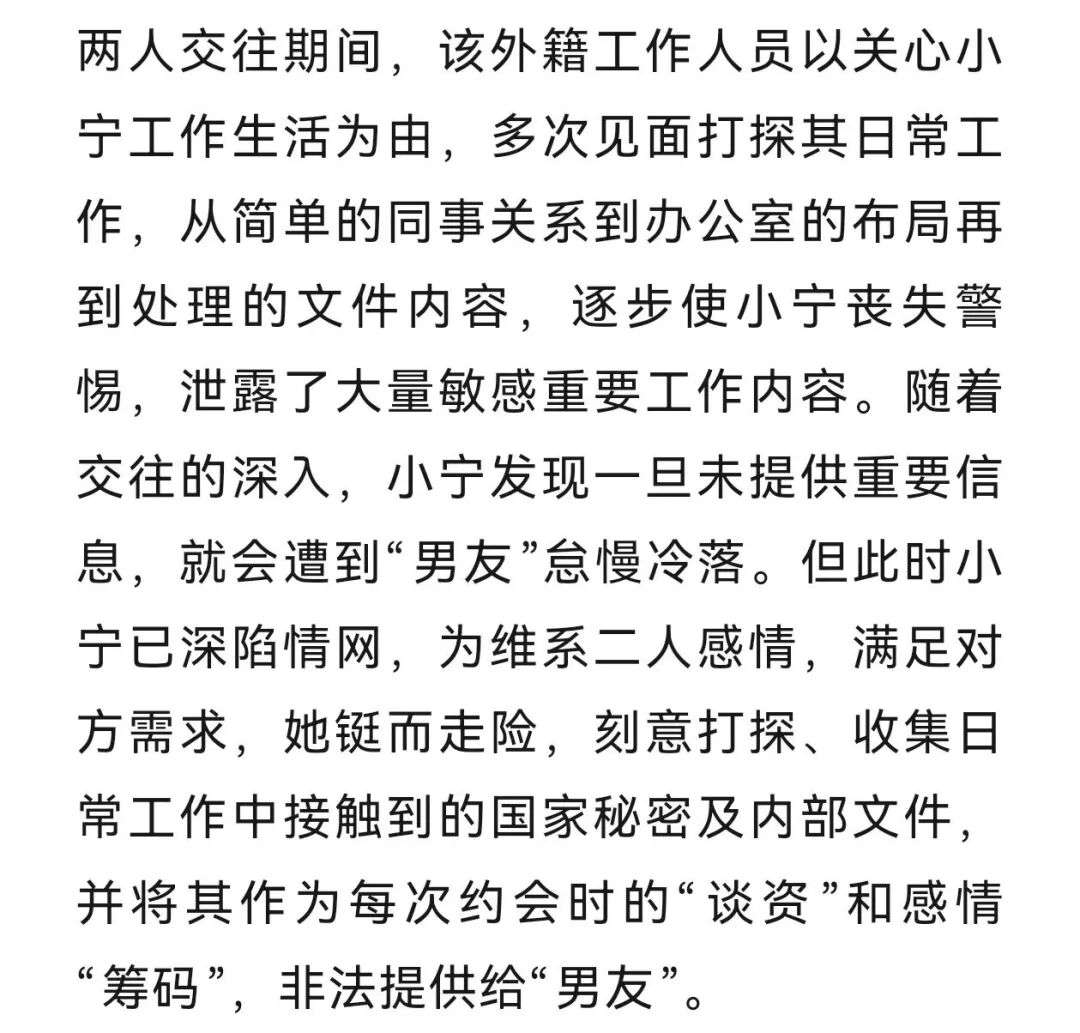 近日,国家安全机关破获一起某机关单位工作人员坠入境外间谍情报机关工作人员情感陷阱,利用职务之便为境外窃取、非法提供国家秘密的案件。