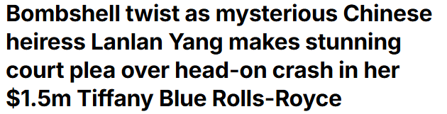 7月26日凌晨,悉尼东部郊区玫瑰湾,23岁的杨兰兰驾驶着一辆蒂芙尼蓝劳斯莱斯库里南SUV,突然驶入逆行车道,与一辆黑色奔驰迎面相撞。