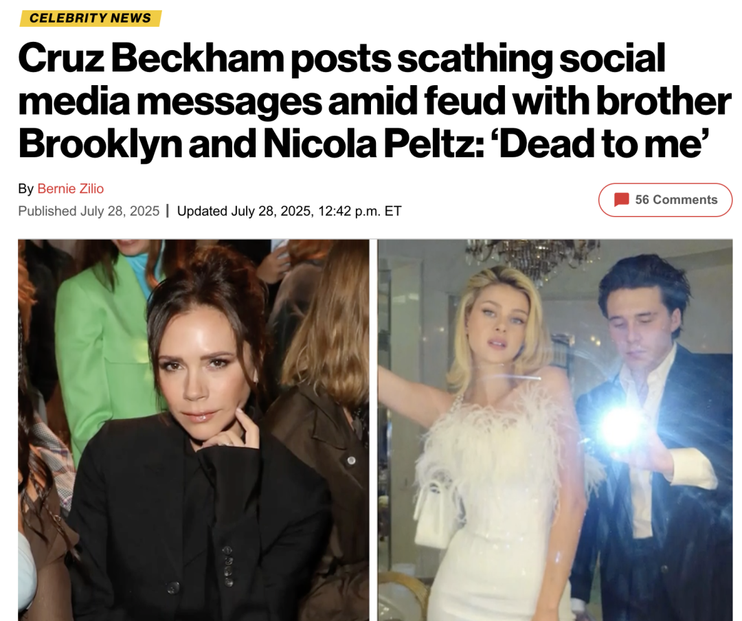 布鲁克林在至亲与挚爱之间被迫选边站,内心想必也很煎熬。小贝和维多利亚看着一手带大的儿子渐行渐远,心里肯定也不是滋味。贝克汉姆家族多年来精心打造的“完美家庭”品牌出现污点裂痕…