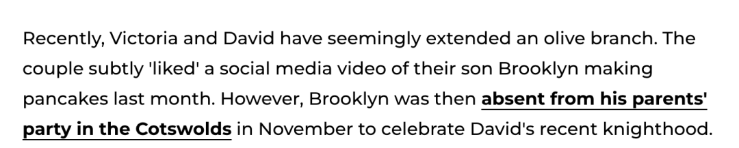 10月份,小贝夫妇俩可是给大布的做饭视频点赞了,又低头示好一次,但换来的是大布拒绝出席封爵仪式。