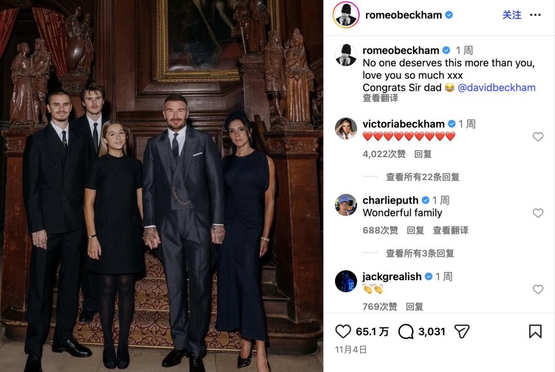 全家老小盛装出席,小贝的二儿子罗密欧激情发文:“没人比你更配得上这个,我超级爱你。恭喜骑士老爸。”