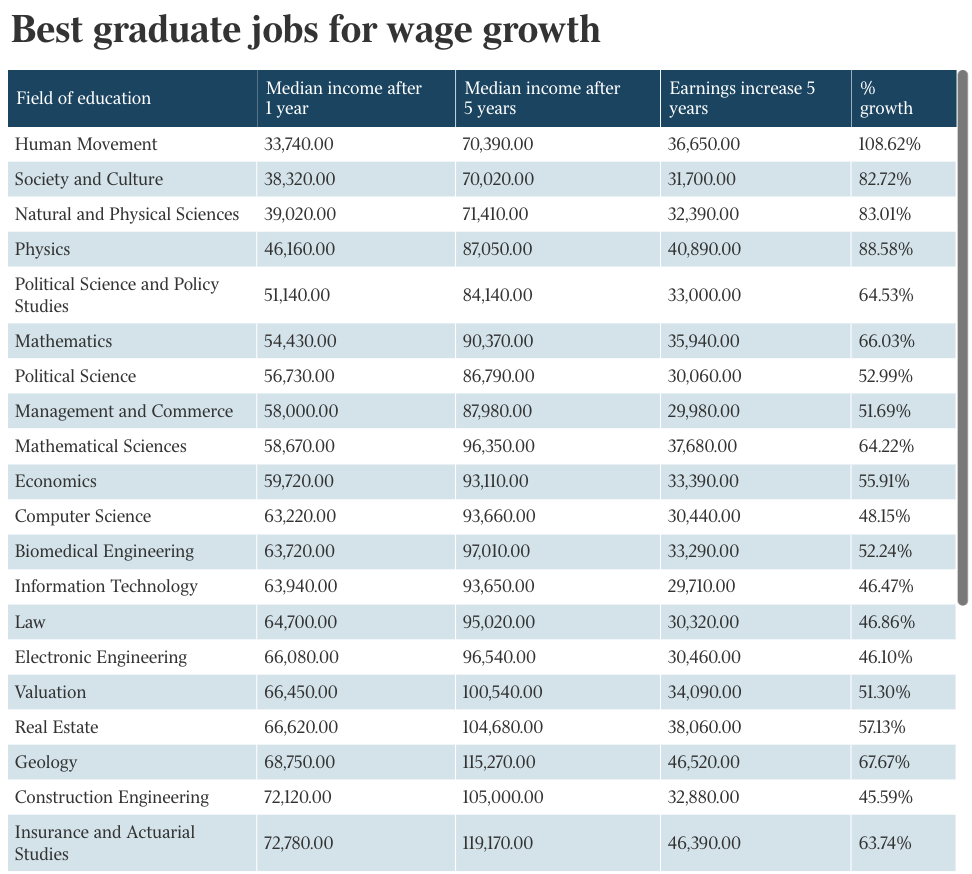 澳大利亚就业与技能报告显示,各专业毕业生在职业生涯前五年普遍实现35%的薪资增长——从63,500澳元跃升至85,500澳元。