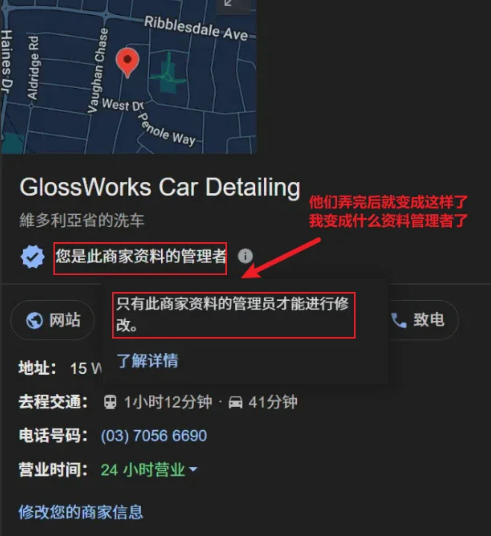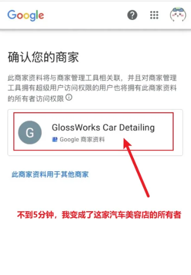 他的 Google 账号竟然被添加为一家叫 “GlossWorks Car Detailing” 的汽车美容公司的“资料所有者”!