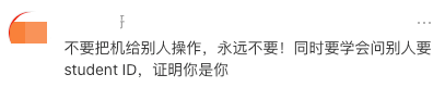 “不要把机给别人操作,永远不要!同时要学会问别人要student ID,证明你是你。”