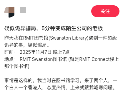 近日,发生在墨尔本RMIT大学的一桩“离谱到无法想象”的骗局在小红书上引发巨大讨论。