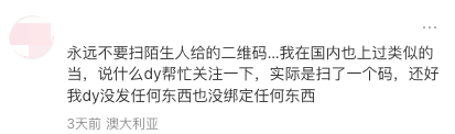 “永远不要扫陌生人给的二维码…我在国内也上过类似的当,说什么dy帮忙关注一下,实际是扫了一个码,还好我dy没发任何东西也没绑定任何东西。”