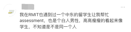 “我在RMIT也遇到过一个中东的留学生让我帮忙assessment,也是个白人男性,高高瘦瘦的看起来像学生,不知道是不是同一个人。”