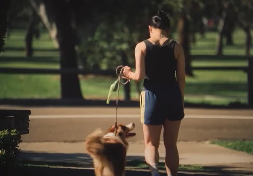 随后画面一转:这位女士改用Lyka的狗粮喂狗,遛狗的时候笑容满满。
