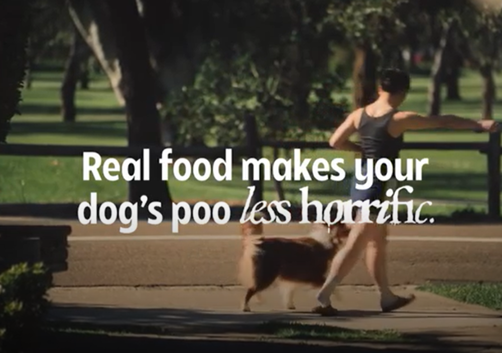 片尾字幕写道:“真正的食物让你的狗便便不再恐怖。”