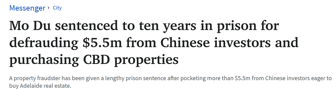 36岁的南澳华人房产中介杜默,因虚报价格骗取3名中国投资者500多万澳元,被判刑10年,其中一个受害人还是他的亲戚。