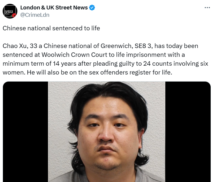 据BBC及《卫报》报道,在英国伍尔维奇(Woolwich)刑事法庭宣判时,法官Christopher Grout称徐超为“性侵犯者”,并指出其犯罪行为“精心策划”,对女性构成极高风险。