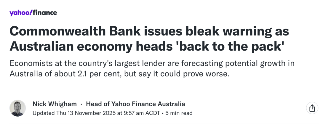 该行经济学家预计,澳洲潜在GDP增速约为2.1%,但近期经济数据显示,实际增长可能更低。
