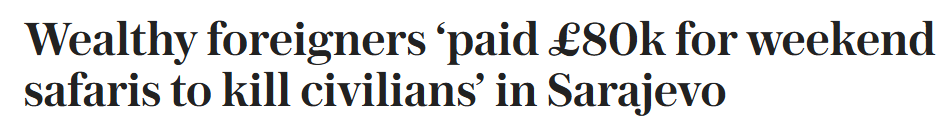 上世纪90年代,在造成惨重伤亡的波黑战争(又称波斯尼亚战争)期间,竟然有一群欧洲和美国的富人花钱到萨拉热窝“猎杀”平民百姓。