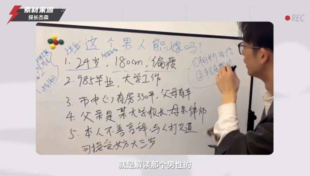 顾名思义,这类视频就是通过分析相亲简历来判断“这个男人能嫁吗”,其表达宗旨就是“优点可能是假的,缺点只会更严重”。因为前后反差大、自带流量“爽点”迅速走红,这一赛道养出了不少相亲分析师博主。