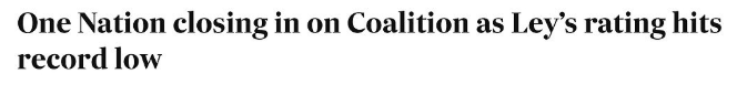 尽管联盟党决定放弃对“净零排放”的承诺,但能源政策的转变未能阻止其支持率继续下滑。最新民调显示,联盟党的支持率已创下历史新低,而一国党的支持率则持续攀升。