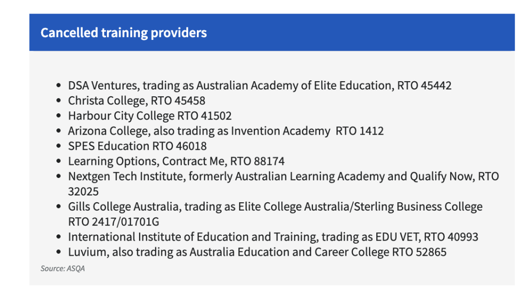 最新被取消资格的15家培训机构名单包括:DSA Ventures、Christa College、Harbour City College、Arizona College、SPES Education、Learning Options、Nextgen Tech Institute、Gills College Australia、International Institute of Education and Training、Luvium等。监管部门提醒,凡是没有课堂、不需要学习、不要求评估、快速拿证、远低于市场价的课程,都要提高警惕,避免落入“现金换资格”的骗局。