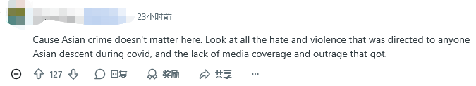 “针对亚裔的犯罪在这里都不叫事。看看在新冠疫情期间针对亚裔的所有仇恨和暴力,以及媒体报道的缺乏和公众的冷淡。”