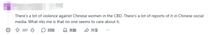 “在CBD,存在大量针对华裔女性的暴力行为。中文的社交媒体上对此有很多报道。令我恼火的是,似乎人们漠视这一切。”