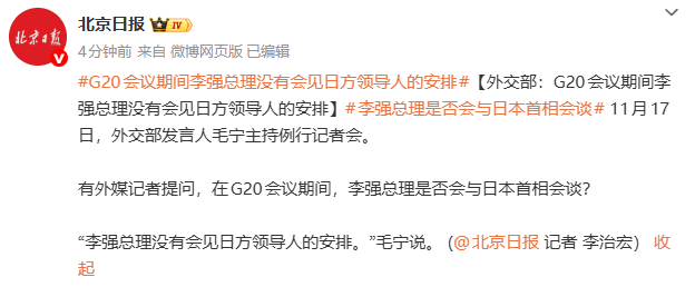 收藏外交部:G20会议期间,李强总理没有会见日方领导人的安排