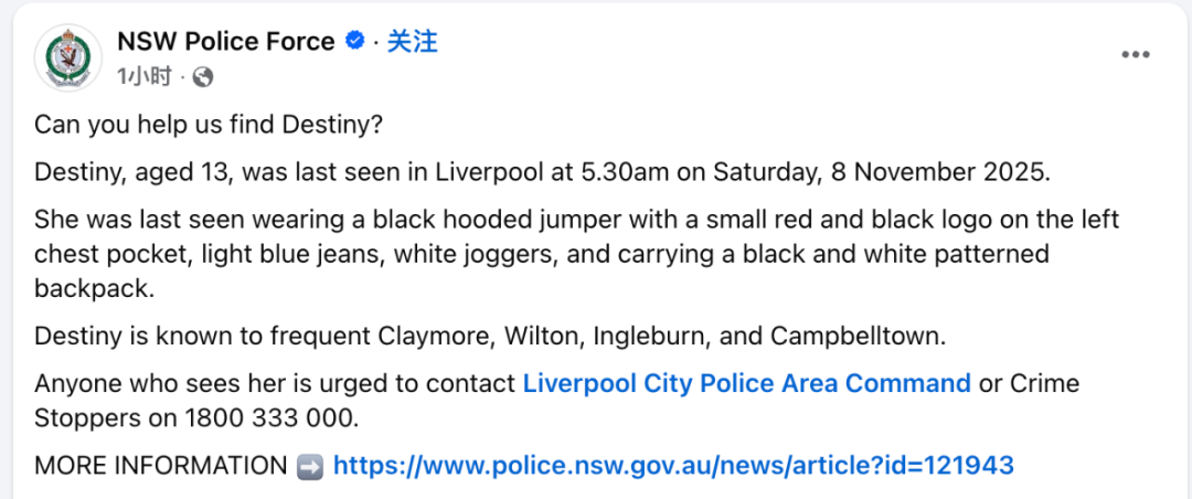 如果有人看到她,请马上联系 Liverpool City Police Area Command,或者拨打 Crime Stoppers 1800333000。