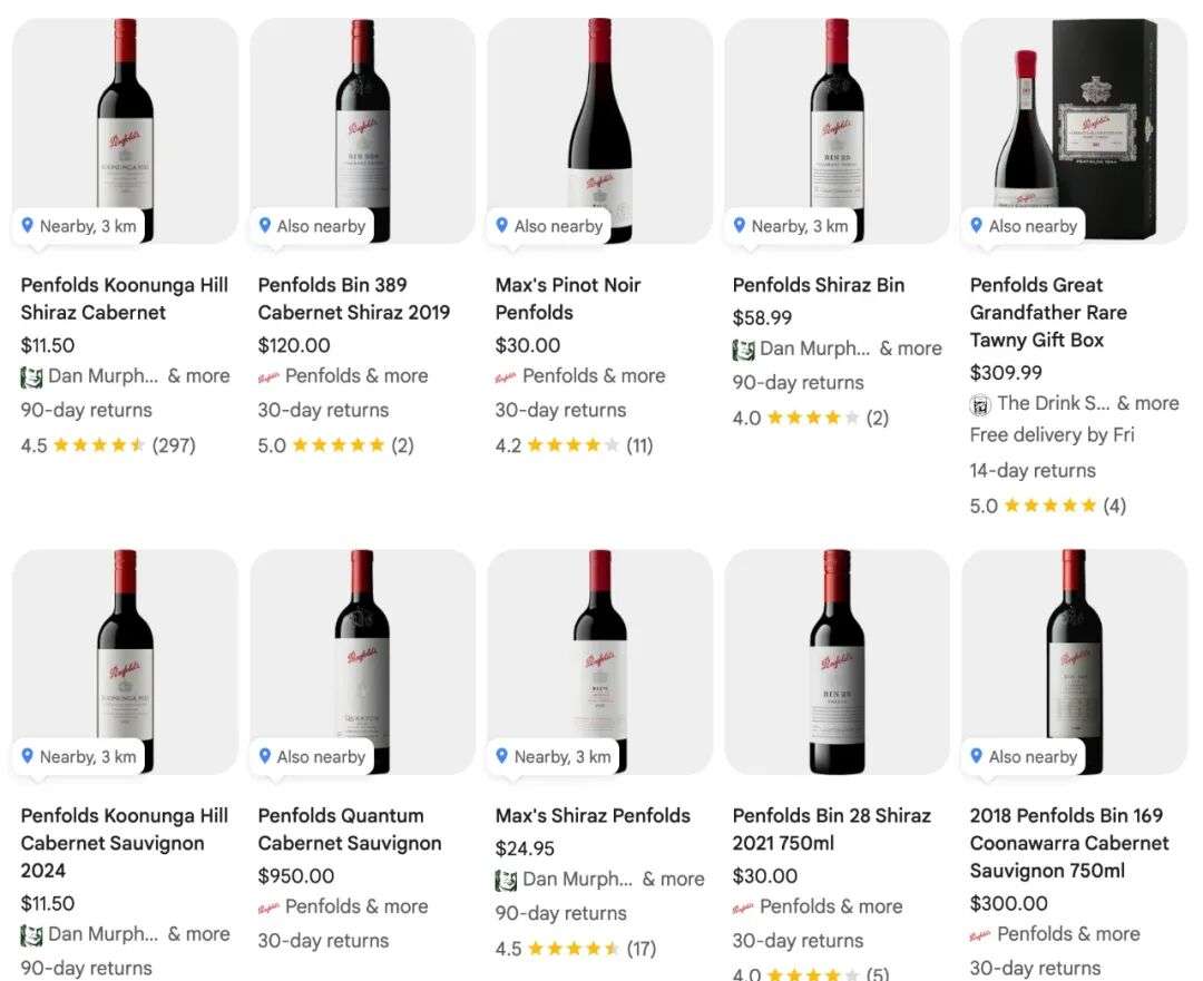 价格根据品质从十几澳币到几百澳币不等,最受国内青睐的当属奔富,无论是自己喝还是送人都很有排面。