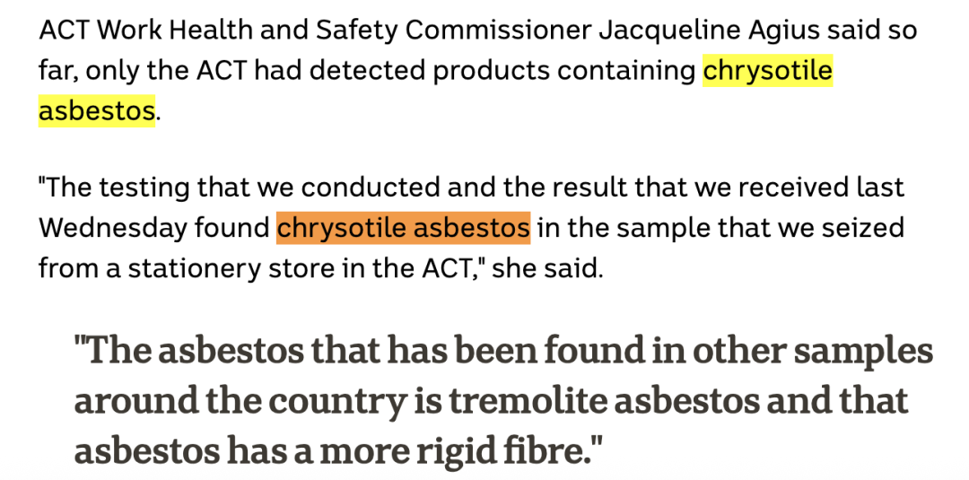 ACT 工作健康与安全专员杰奎琳·阿吉乌斯(Jacqueline Agius)透露,他们在当地一家文具店抽检到的样品中,发现了温石棉纤维(chrysotile asbestos)这与其他地区检测出的成分不同。