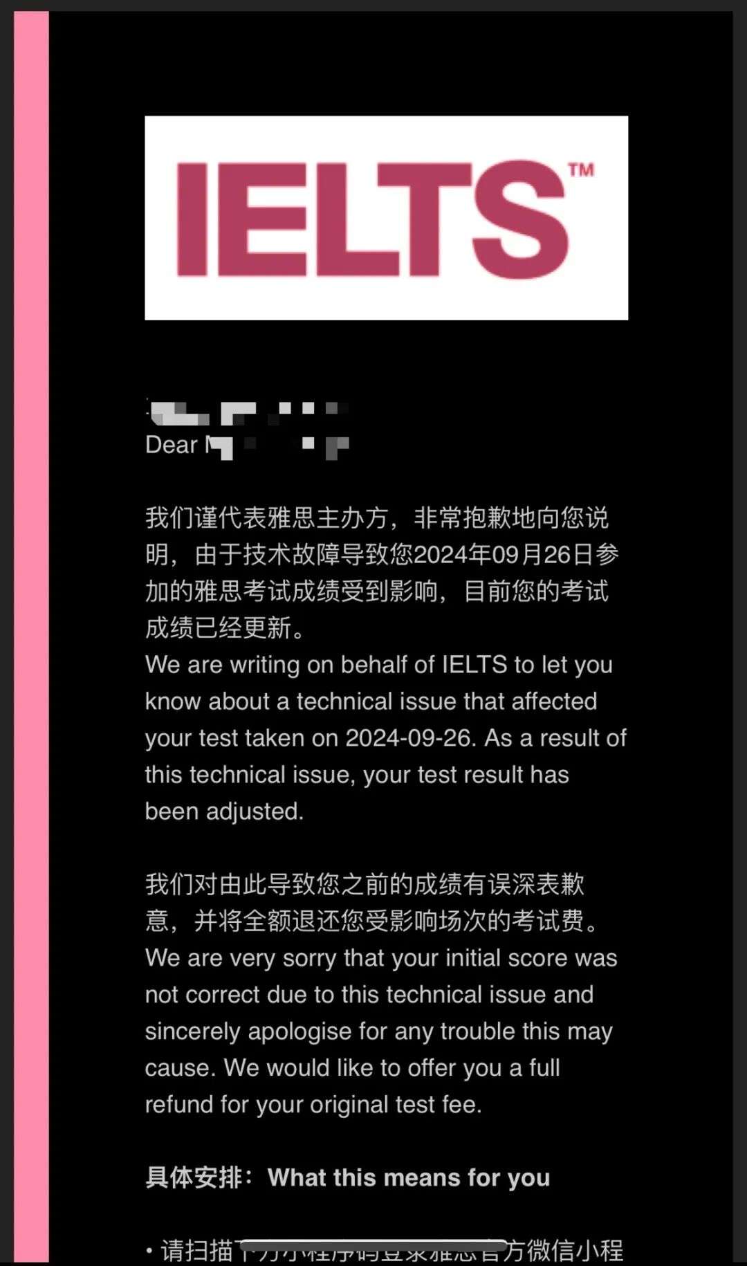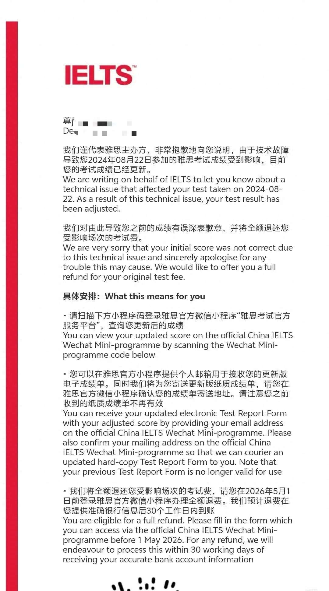 近日,雅思主办方向部分考生发送邮件,表示由于技术故障导致考生参加的某次雅思考试成绩受到影响,目前考试成绩已经更新,同时对由此导致成绩有误深表歉意,并将全额退还受影响场次的考试费。
