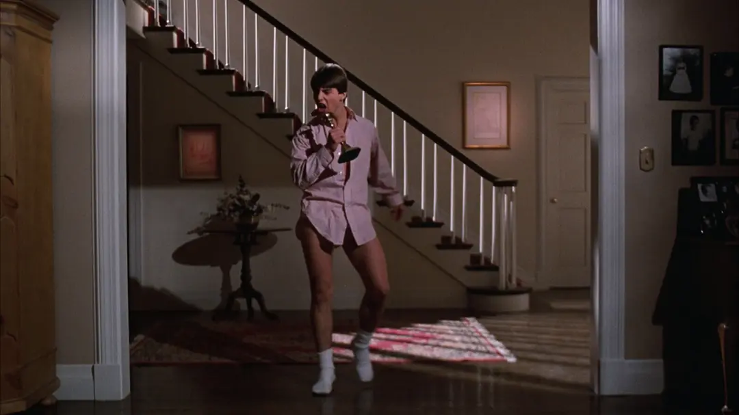 影片的标志性镜头,来自克鲁斯的一段即兴演出。他身着一件粉色衬衫、一条内裤、一双白色袜子,以左腿紧绷的姿态,滑入镜头。他在鲍勃·塞格的《老式摇滚》中,癫狂一般地扭动身姿。