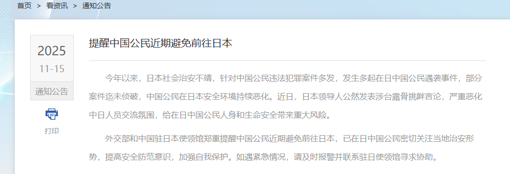 因为日本首相的一系列逆天言论,导致中日关系十分紧张。中国外交部已经连续发布多次警告声明:不要前往日本。