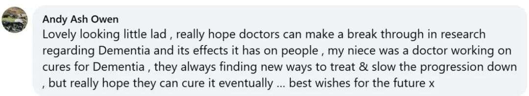“真是个可爱的小家伙,真希望医生们能在痴呆症研究上取得突破,减轻它对人们的影响。我侄女以前是医生,致力于研究痴呆症的治疗方法。她们一直在寻找新的方法来治疗并延缓病情发展,真心希望她们最终能治愈这种病……祝未来一切顺利。”