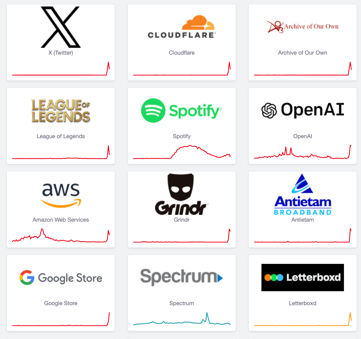 宕机期间,X的部分功能中断,多家网站也陷入访问受阻。根据故障跟踪平台Downdetector的数据,除X之外,也有大量站点受到影响,相关报告数量持续攀升。用户在访问X、ChatGPT、DoorDash、IKEA,以及纽约市大都会运输署(MTA)等网站时,都看到与Cloudflare相关的错误信息。