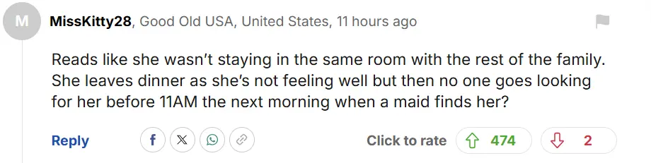 她因为觉得不舒服提前离开了晚餐,但直到第二天早上 11 点左右被工作人员发现之前,家里似乎没有任何人在寻找她?”
