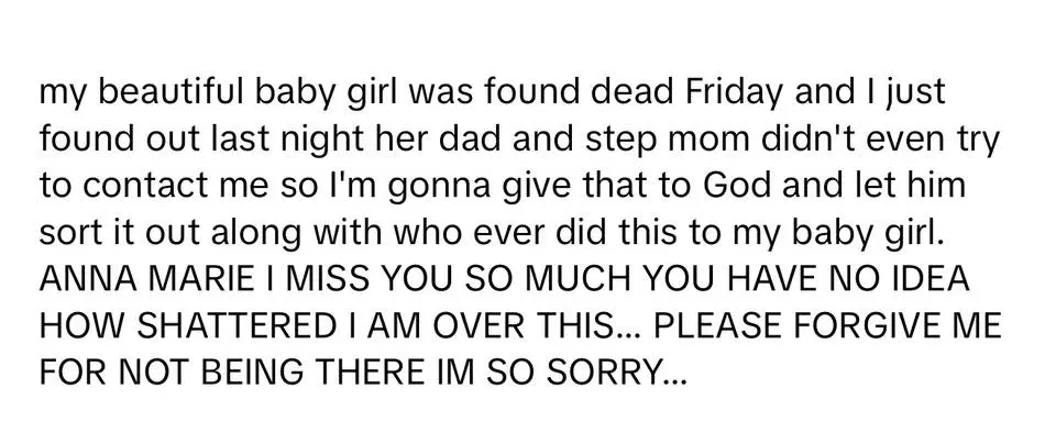 “我美丽的宝贝女儿在周五被发现死亡,而我昨晚才得知这件事。她的父亲和继母甚至没有试图联系我,所以我只能把这一切交给上帝,让他去处理,包括对我宝贝女儿做下这种事的人。