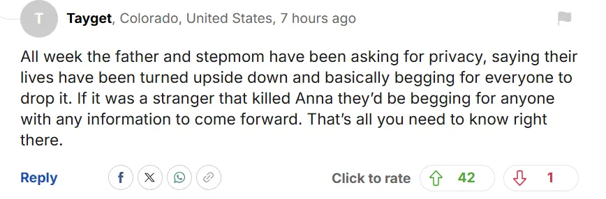 “整整一周以来,安娜的父亲和继母一直在要求大家给他们隐私,说他们的生活被彻底颠覆了,基本上就是在求大家不要再讨论这件事。