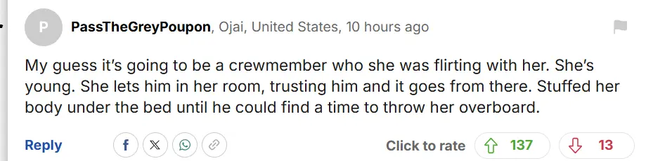 然而,在游轮航行至墨西哥与佛罗里达之间的国际水域时,工作人员清洁舱房,发现了她的尸体——女孩的身体被毯子紧紧包裹,外面又压着救生衣,整个人被塞进床底…………