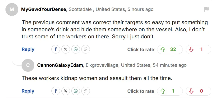 “像安娜这样的年轻女性就是船工的目标,很容易在她们的饮料里动手脚,然后把她们藏到船上的某个地方。另外,我不信任船上的一些工作人员。抱歉,但我就是不信任。”