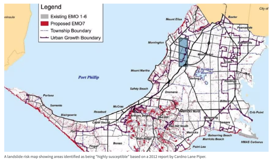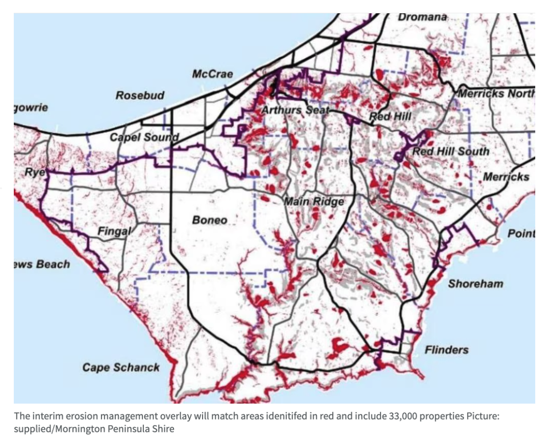这项临时规划覆盖范围巨大,从 Mt Eliza 一直延伸到 Portsea,几乎整个半岛靠山靠海的建筑区都被纳入其中,共计影响超过 33,000 宗物业。所依据的滑坡风险地图来自 2012 年的一份研究,而被标记为红色区域的地区将全部纳入监管,直至未来 permanent(永久性)版本制定完成。值得注意的是,这项临时措施无需公开展示,也不接受居民意见提交,会直接上报维州规划部长批准。只有在未来要将 EMO 转为长期管控时,才会开展公开咨询程序。