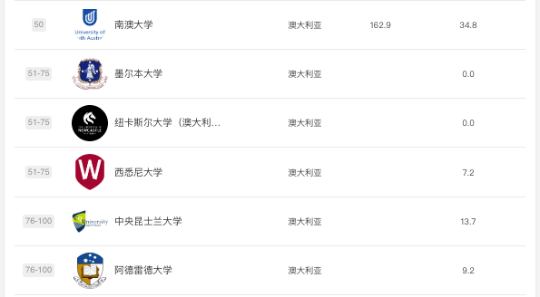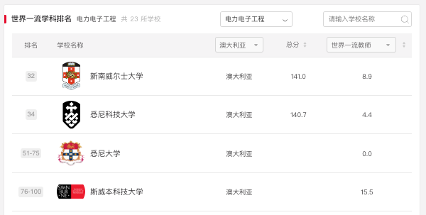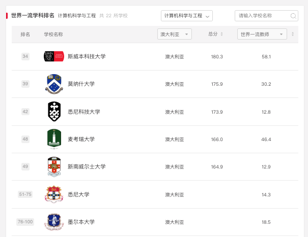 前三名:斯威本科技大学(全球第34)、莫纳什大学(全球第39)、悉尼科技大学(全球第42)。