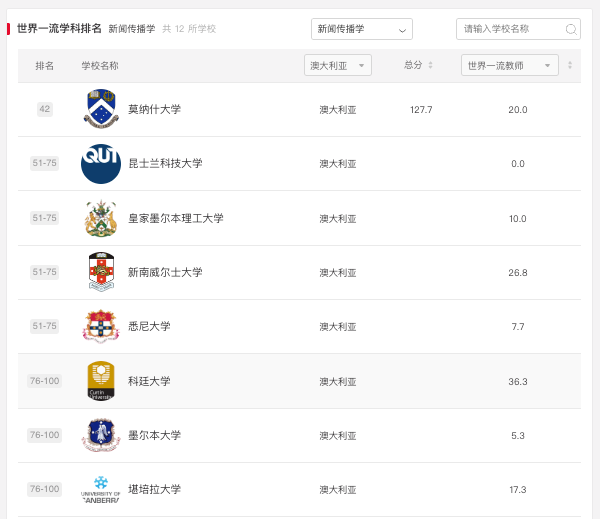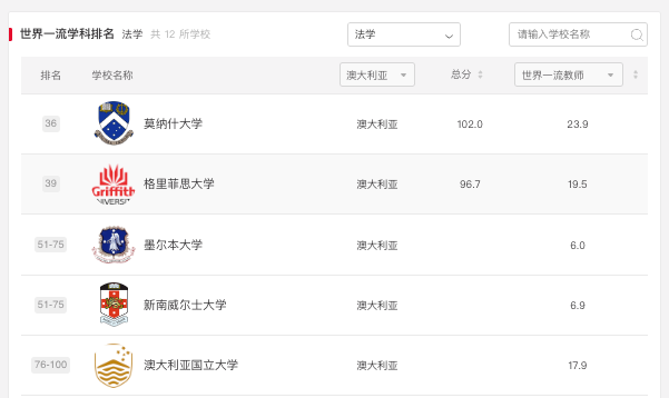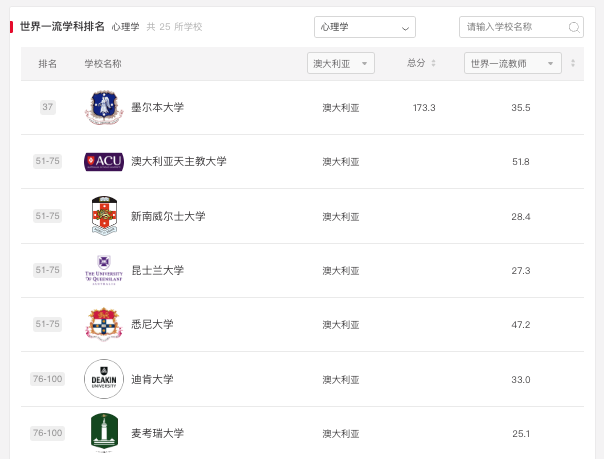 前三名:莫纳什大学(全球第36)、格里菲思大学(全球第39)、墨尔本大学(全球第51-75)。